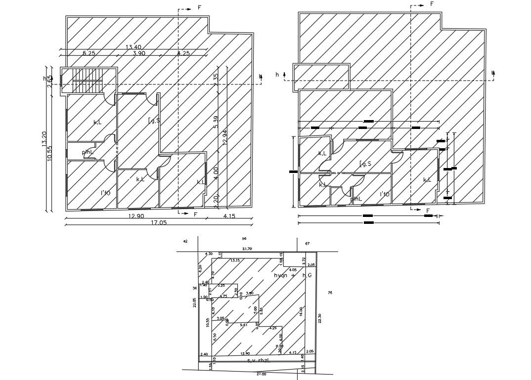 2D CAD drawing of 3 BHK apartment house floor plan with plot size and land survey detail. download 3 bedroom apartment house plan with some AutoCAD hatching design.