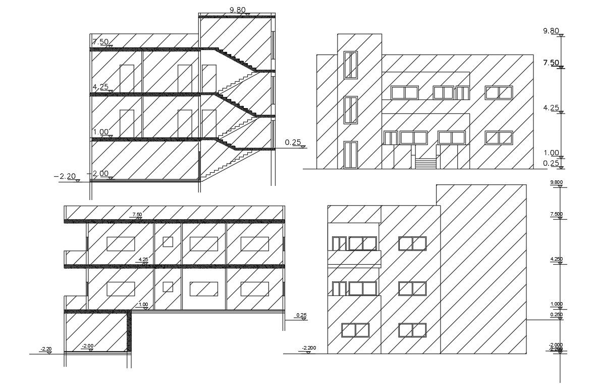 2d CAD drawing of architecture house bungalow front and rear building elevation design and section drawing with dimension detail. also shows floor level standard staircase and some AutoCAD hatching design.