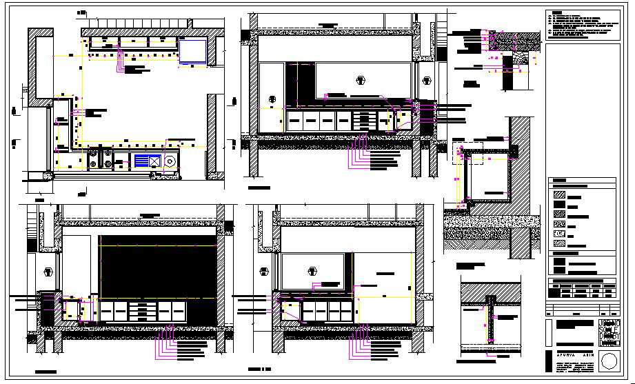 kitchen detail in stone partition, in standing platform, with dimension, 20mm thick flooring, 120mm thick floor R.C.C, shutter, drawer etc.typical partition detail & section detail.