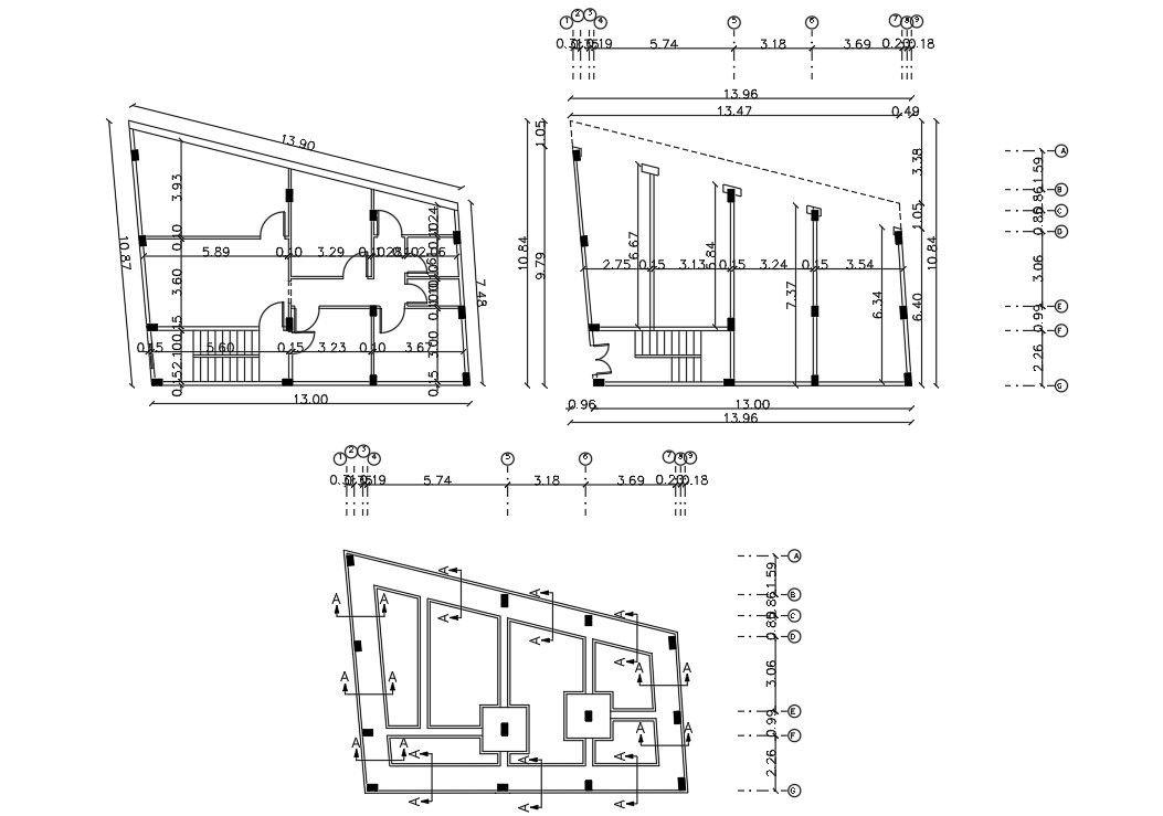 2d CAD drawing of the shop on the ground floor and first floor 2 BHK residence house layout plan with column and foundation plan with excavation detail. download DWG file of the retail shop with top floor house and get more detail of dimension in meter format.