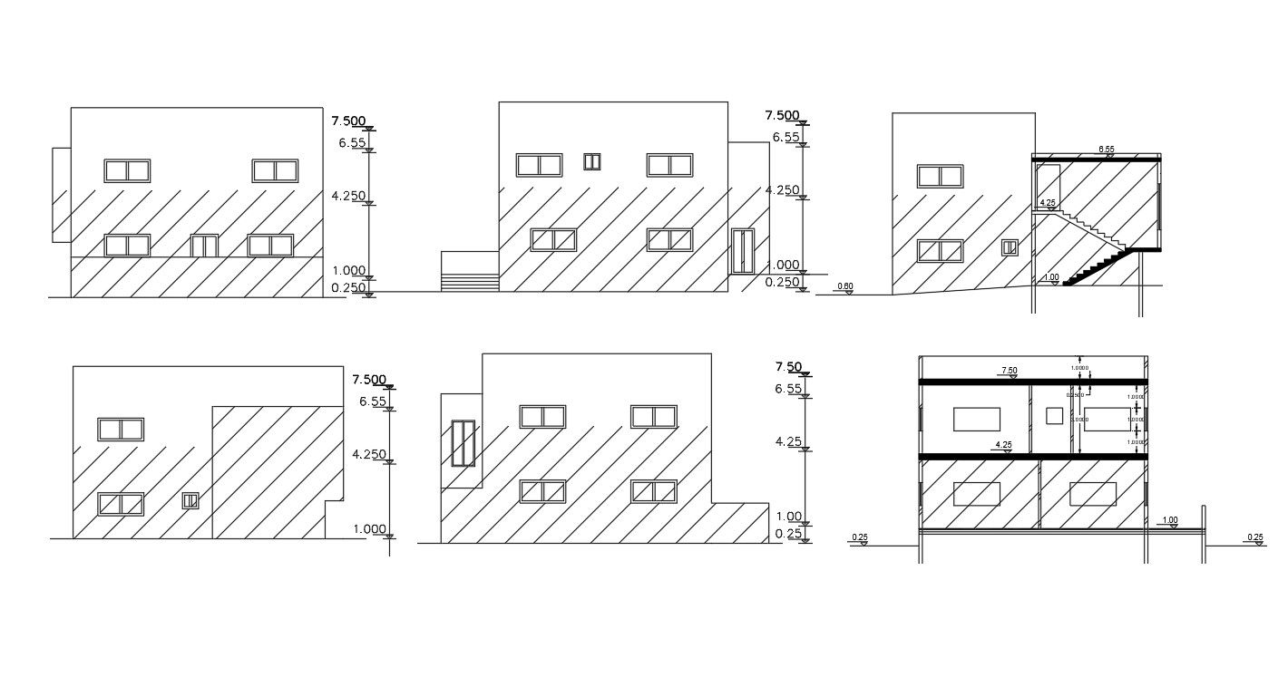 this is 5 BHK G + 1 House building sectional and elevation design which shows all side views with dimension detail, door, and window marking design. download DWG file of house building design AutoCAD drawing.
