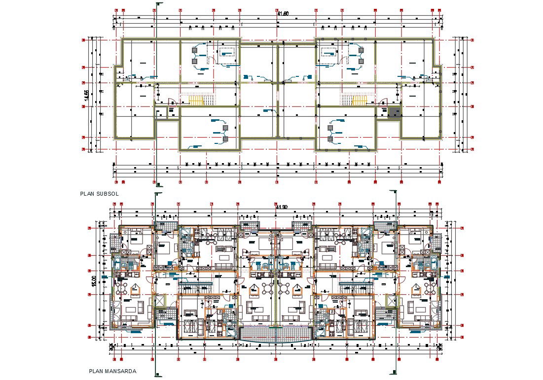 45 by 135 Feet house apartment floor plan design includes fully furniture layout with all dimension detail. there is 6 unit house plan on apartment cluster plan design. download 1 BHK small house apartment design DWG file.