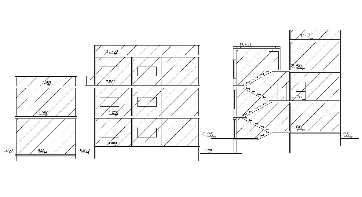 Download free apartment section drawing that shows 3 storey floor level, standard staircase and some AutoCAD hatching design.