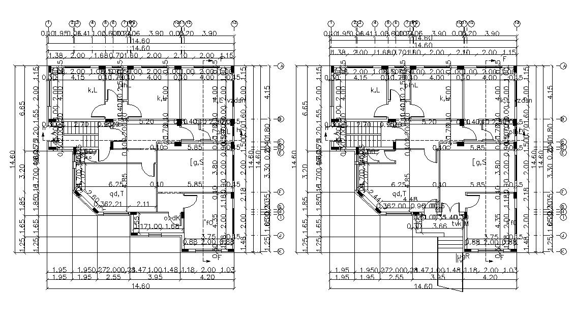 45 feet by 45 feet plot size of house ground floor and first-floor plan design 3 bedroom, kitchen, drawing and living with dining area. It also has a column plan with dimension and working centreline detail in AutoCAD format. download Architecture house plan design DWG file.