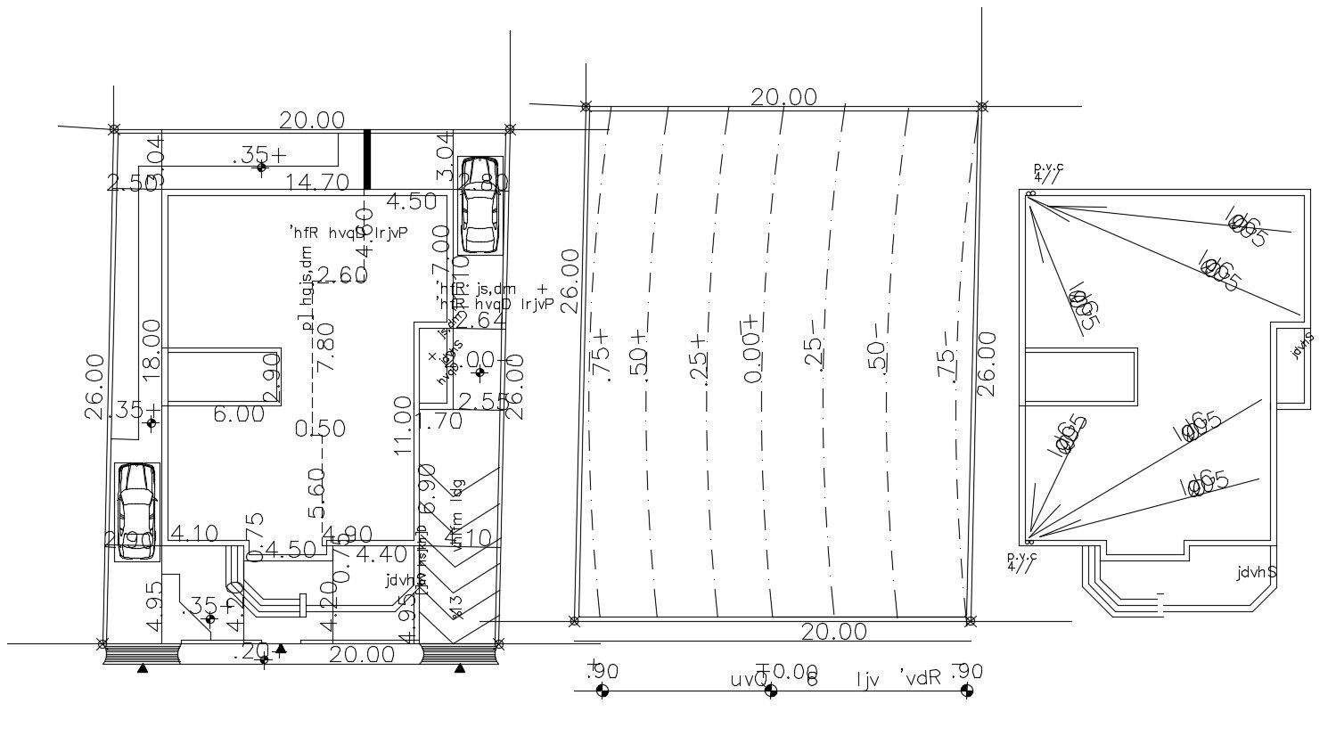 65 feet by 85 feet plot side with a land survey of the bungalow plan also has terrace plan. the ground floor plan shows build-up area with compound wall and 2 car parking ramp design. download bungalow plan design AutoCAD drawing.