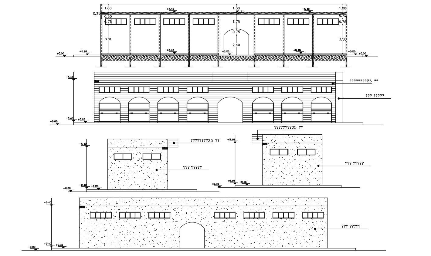 98 by 22 feet plot size for commercial shop building sectional elevation design in all side that shows the rolling shutter on the front elevation, wall footing and RCC floor slab design. download shop building design DWG file.