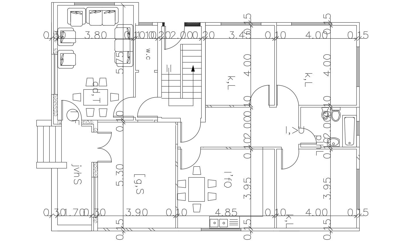 the architecture house ground floor furniture layout plan design that shows 3 bedrooms, kitchen with dining area, living, and drawing-room. download the AutoCAD house plan with dimension detail DWG file.