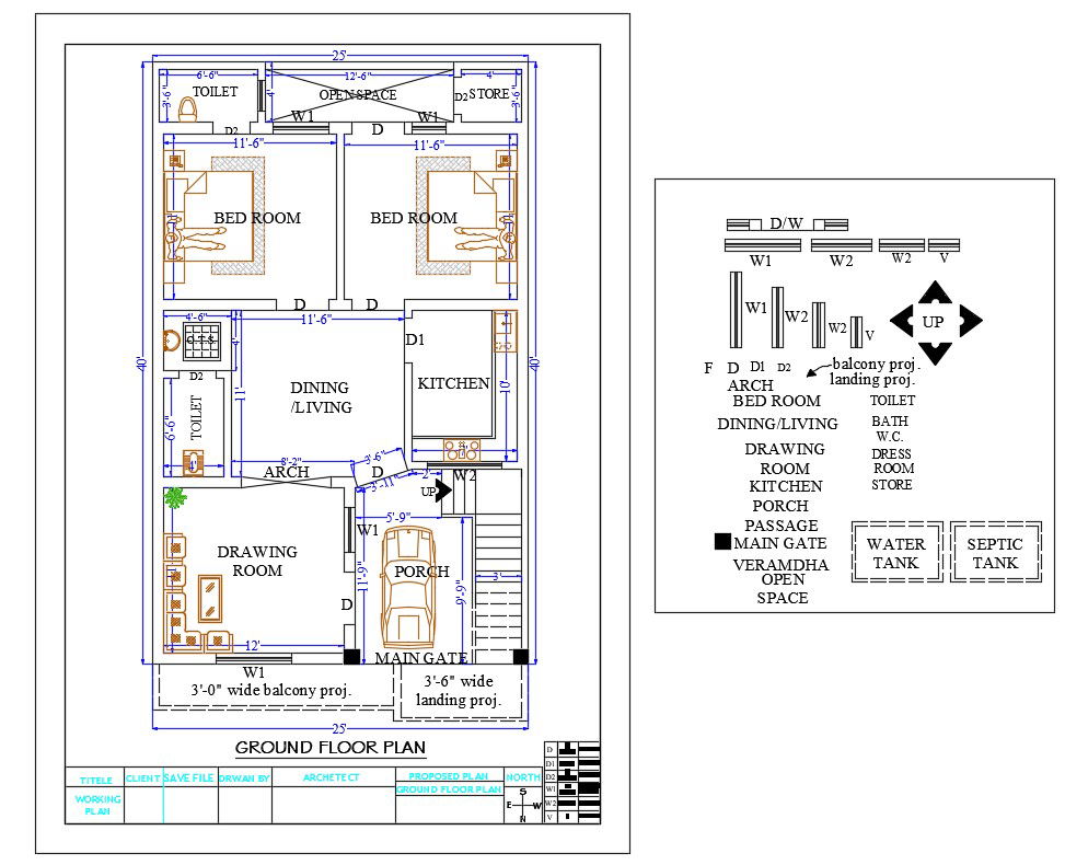 25 X 40 feet plot size for north facing house ground floor plan design includes the furniture layout contains spacious 2 bedrooms, living with dining area, kitchen and drawing rooms. The ground floor has a parking space to accommodate 1 big car and 3 feet wide balcony outside. download architecture AutoCAD house plan design DWG file.
