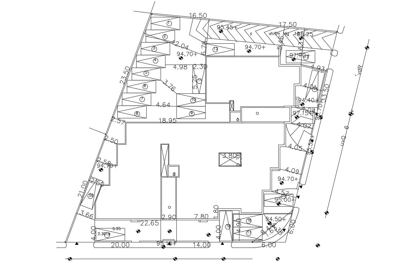 Download free DWG file of apartment ground floor plan that shows construction build-up area, compound wall, parking lot with ramp design and margin dimension detail.