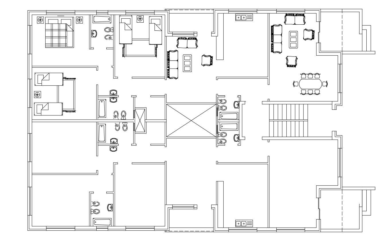 AutoCAD drawing of unit house apartment floor plan design that shows spacious 3 bedrooms with 1 attached toilet, kitchen, dining area, drawing, and family room design. download 3 BHK apartment house furniture layout plan design DWG file.