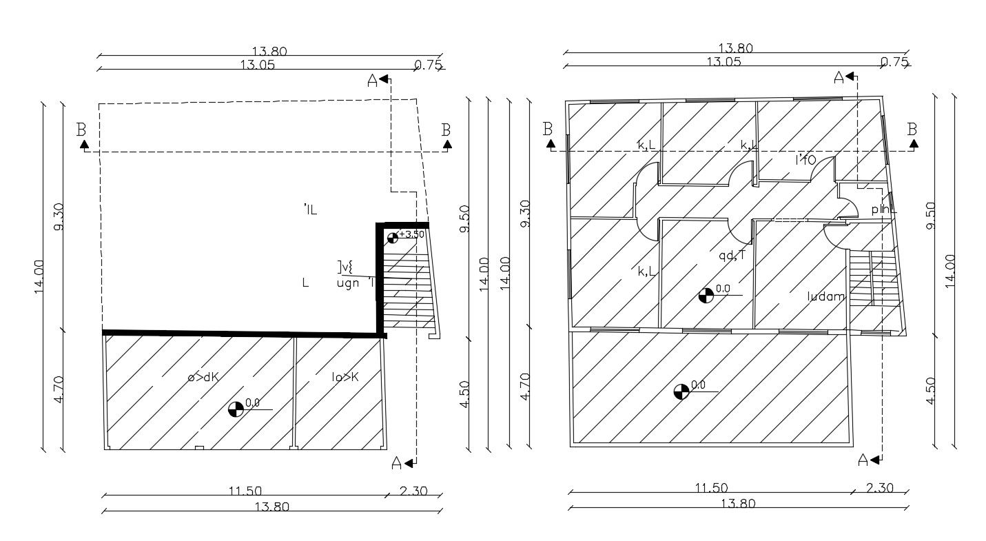 2d CAD drawing of residence house ground floor plan shop and top floor 3 BHK house plan design. also has all dimension detail with some AutoCAD hatching design. download DWG file of 3 BHK house project CAD drawing.