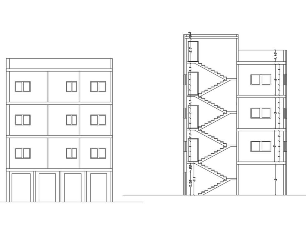 Download free DWG file of 3 storey apartment section drawing that shows ground floor front side shop and top floor residence house building design.