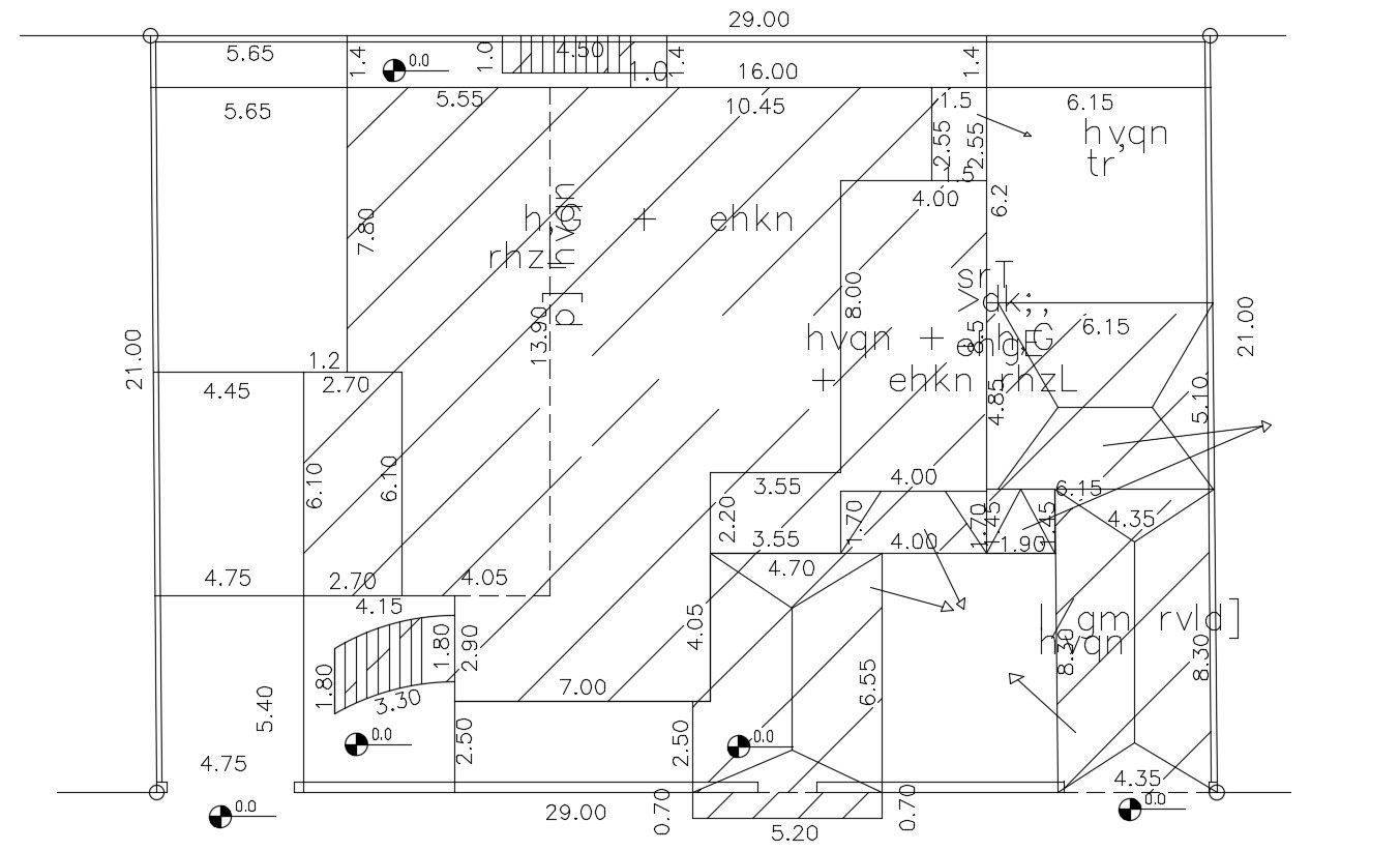 68 by 98 feet residence house plot size in CAD drawing that shows top view roof span sloping design with dimension detail and land survey design. download free DWG file of the house plot plan.