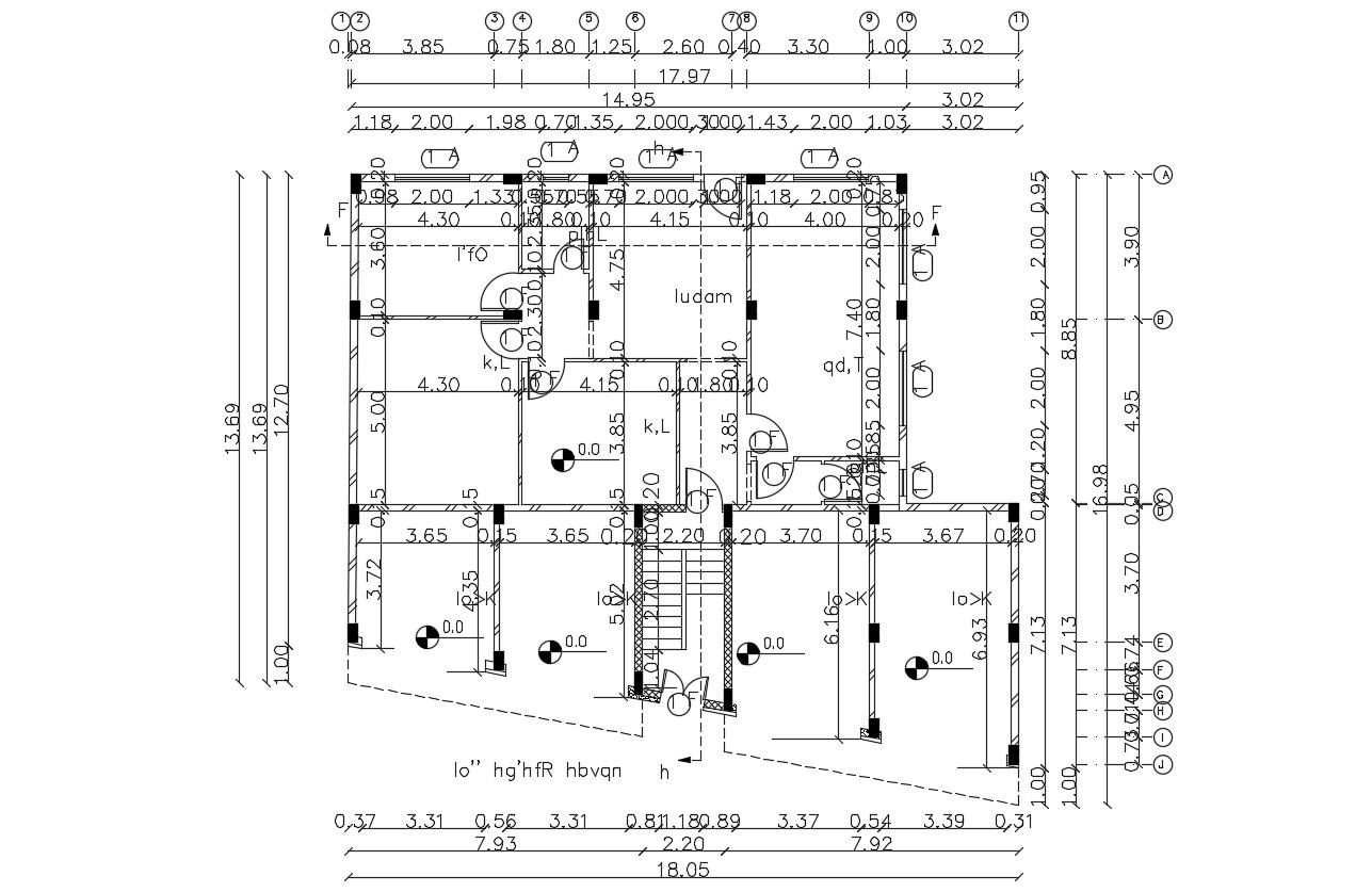 2D CAD drawing of architecture apartment house plan design and front side retail shop on a ground floor plan with all dimension detail and column layout drawing. download apartment with shop plan design DWG file.