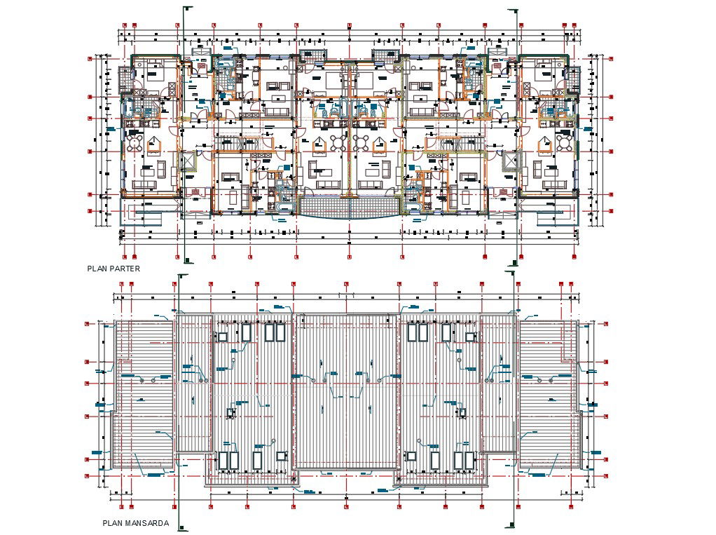 architecture multistorey apartment house plan with furniture detail. this is 1 And 2 BHK house plan with all dimension detail. download AutoCAD file of apartment plan DWG file and use this file for your suitable land property.