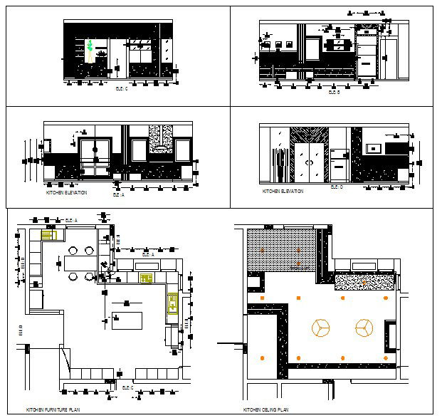 Kitchen design in Kitchen furniture lay-out, Kitchen electric lay-out, kitcheb ceiling plan, kitchen Elevation design & detail with dimension.