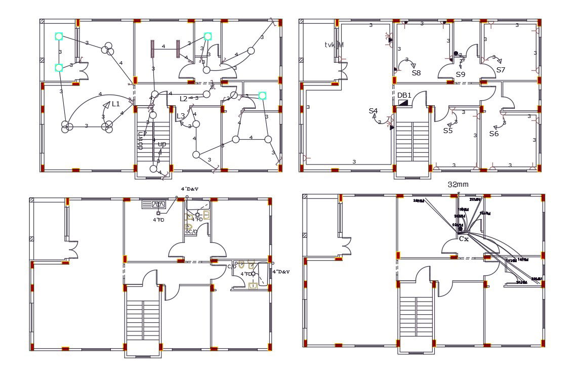 32' X 52' House Electrical Layout plan design that shows a ceiling light point, switchboard point, and wiring plan. also, ahs plumbing layout plan design includes water pipeline and drainage line detail which is directly connected to chamber box. download plumbing and electrical layout plan design DWG file.