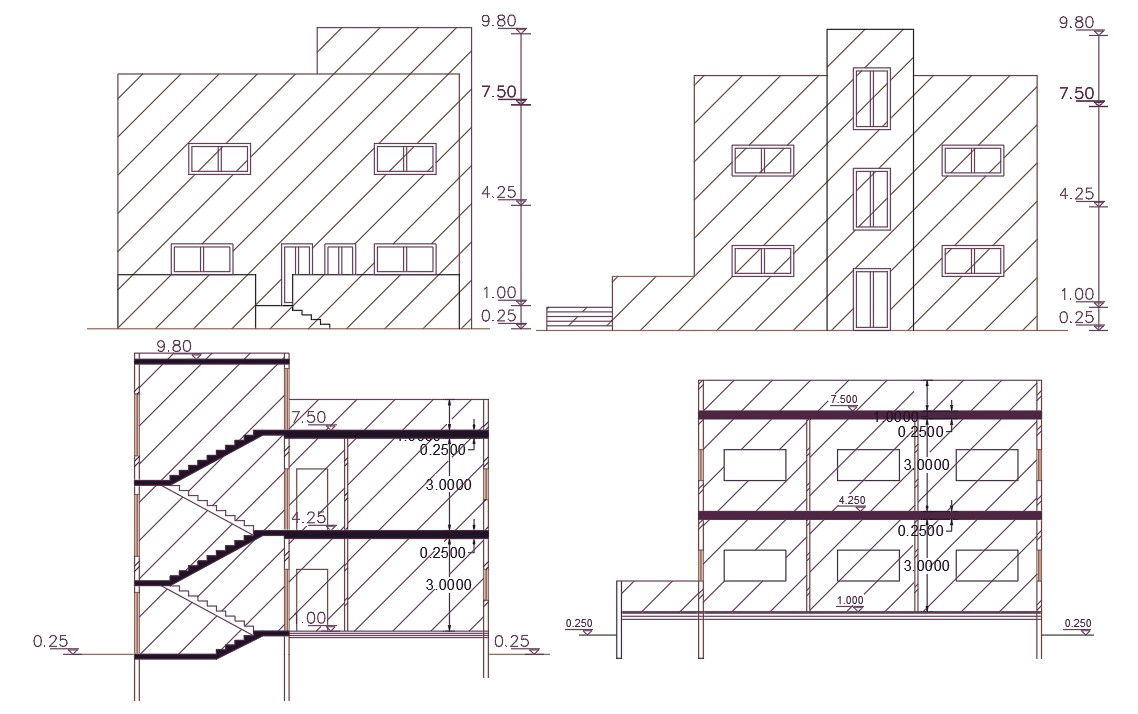 2d CAD drawing of residence house building sectional elevation design that shows front and side view with floor level dimension detail. download