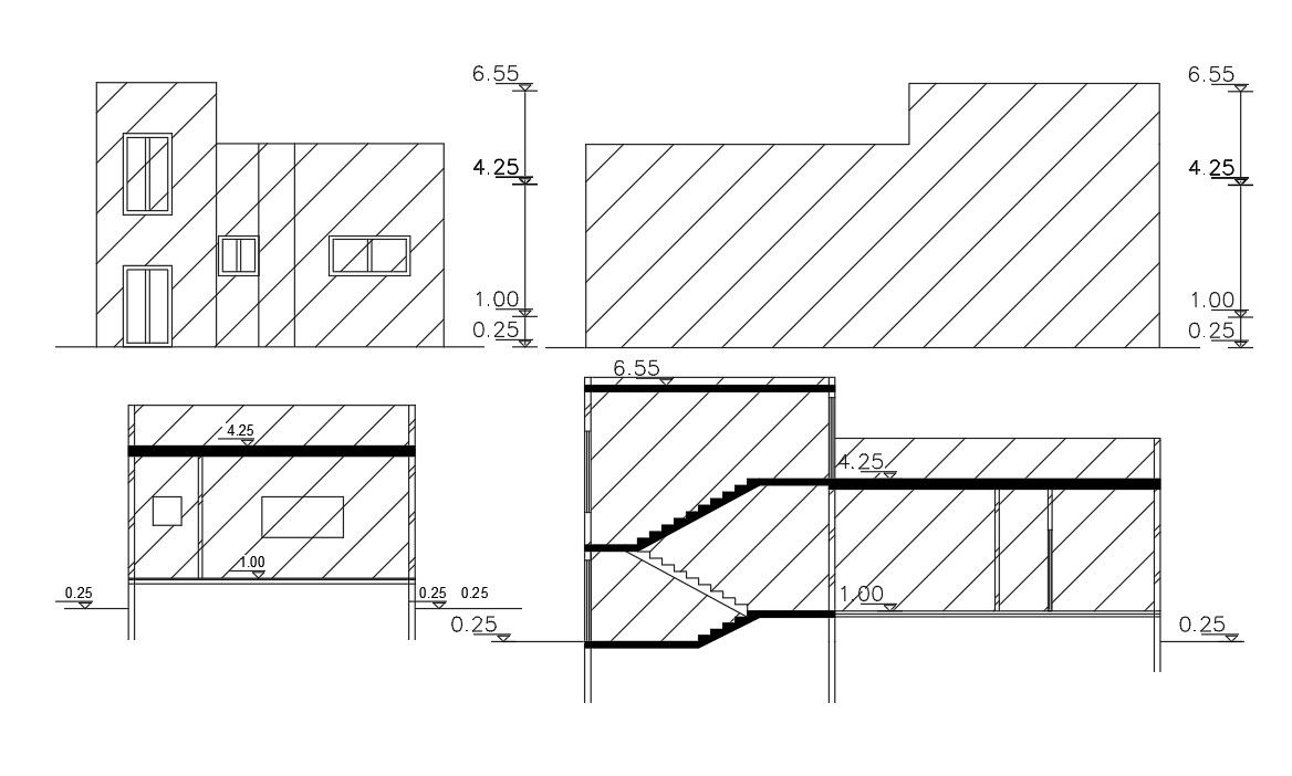 download free single storey house building sectional elevation design that shows RCC slab, staircase, front and side view design with dimension detail.