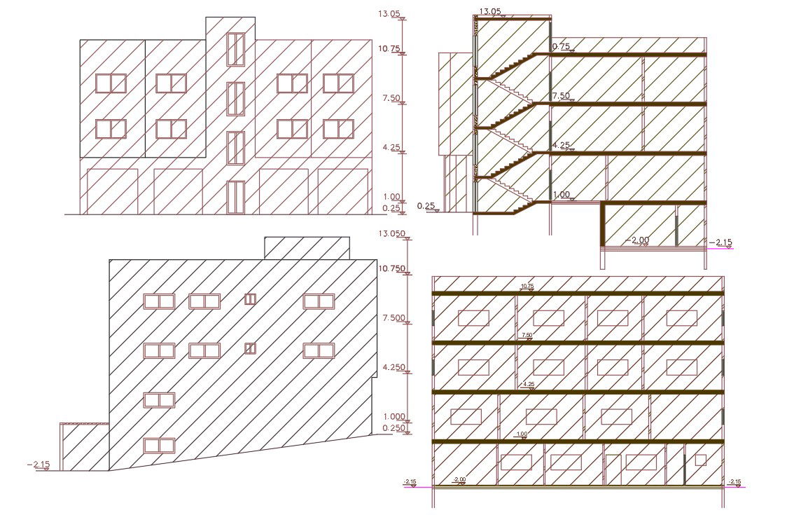 2d CAD drawing apartment building front and rear elevation design that shows shop on the ground floor and top floor house design with dimension detail. download apartment building design with some AutoCAD hatching detail.