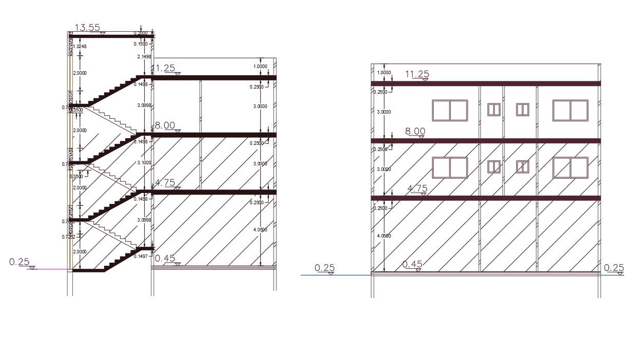 Download free DWG file of 3 storey apartment building section drawing that shows front and side view includes a standard staircase and slab section with dimension detail.