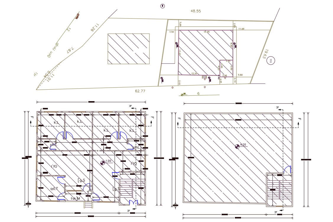 AutoCAD drawing of residence house ground floor and terrace design that shows 4 bedrooms, kitchen, drawing and family rooms with all dimension detail. download 4 BHK house plan with site plot plan and land survey detail.