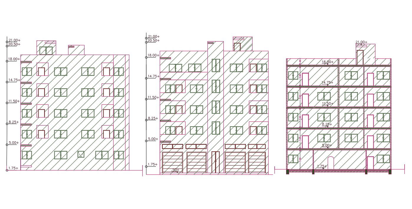 The architecture apartment building sectional elevation design that shows retail shop on the ground floor and top floor 2 unit house design also has door and window marking with dimension detail. download 4 Storey apartment building design DWG file.