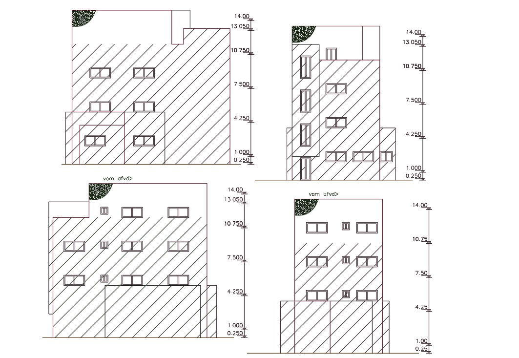 AutoCAD Apartment building elevation design that shows a number of the different side views includes floor level detail, door, and window marking detail with dimension detail and AutoCAD hatching design.