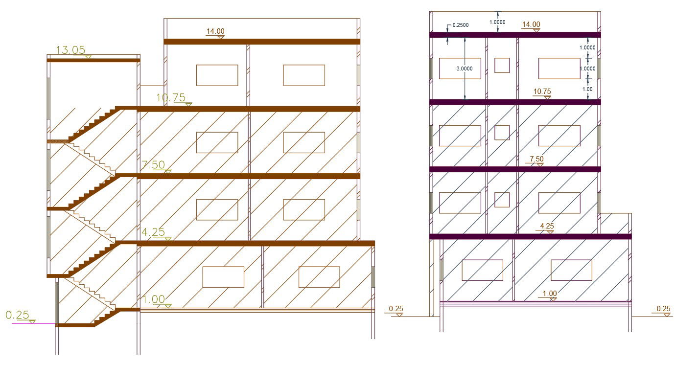 2d CAD drawing of the apartment building section drawing in front and side view that shows standard staircase and slab with dimension detail. download Apartment building section CAD File.