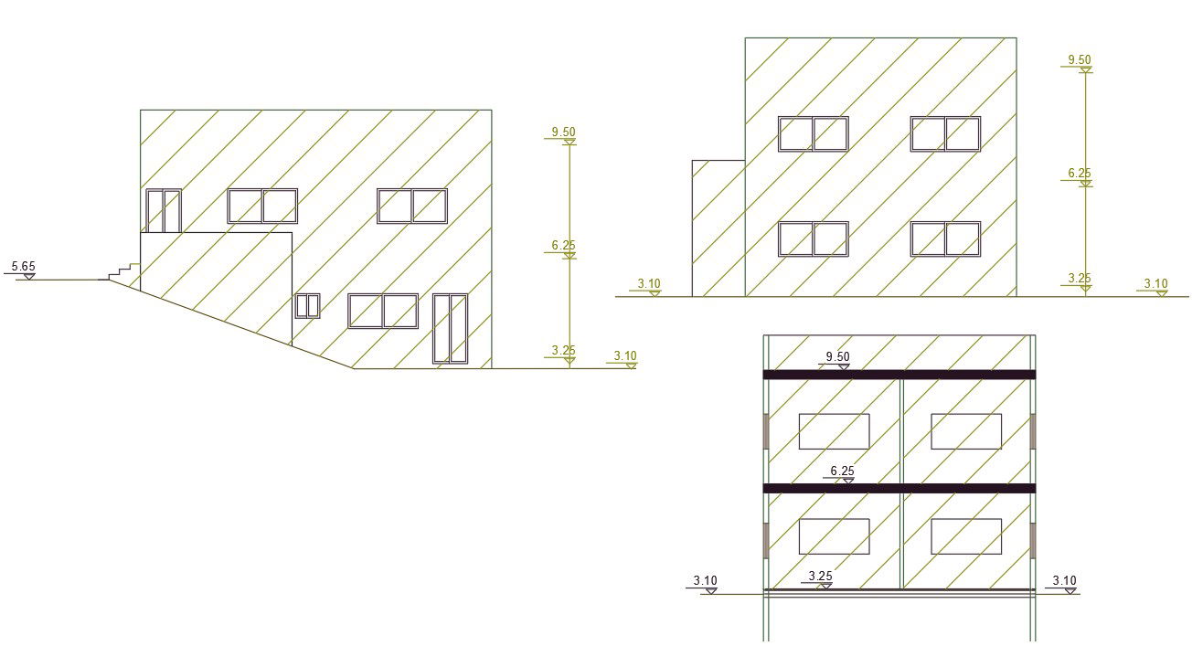 2 storey small house building section and elevation design that shows dimension detail, door and window marking detail. download free house building design DWG file.
