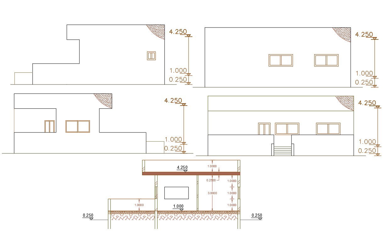 Single storey 2 BHK house building sectional elevation design all side view that shows render visualisation for help to how looks the building after construction. download 40 feet width and 32 feet depth house building design DWG file.