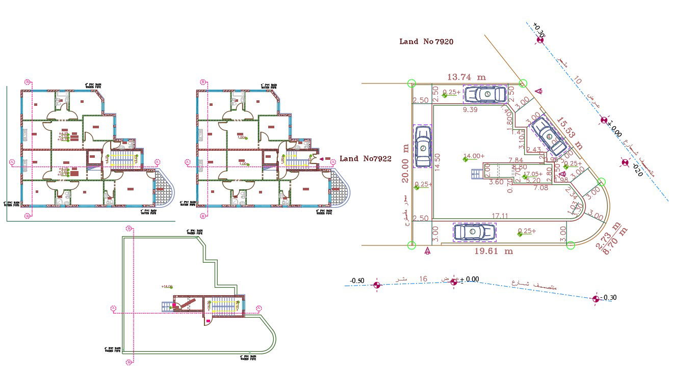 The architecture 2 BHK Joint House Plan ground floor and terrace design that shows window marking and master plan design that shows build-up area, compound wall and car parking space with dimension detail. download joint house plan design DWG file.