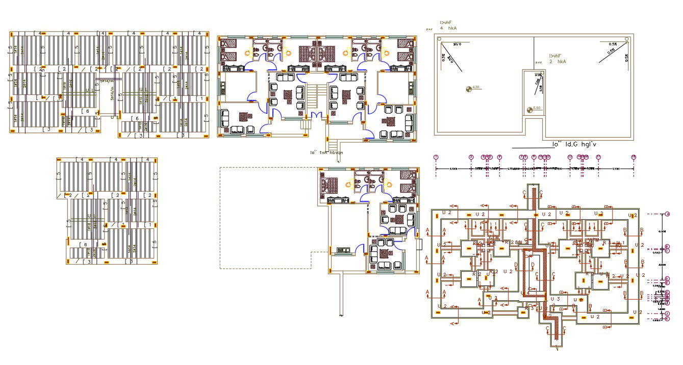 40 by 82 feet plot size for 2 BHK apartment furniture layout plan and also has foundation plan, column footing excavation, and slab bar structure design DWG file. download 2 BHK apartment plan AutoCAD drawing.