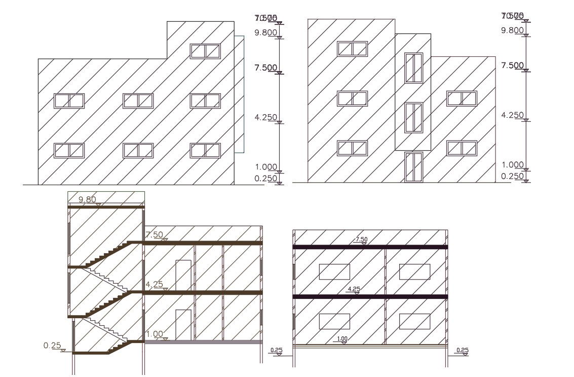 2d CAD drawing of 3 BHK house building front and side view sectional elevation design that shows door and window marking with dimension detail DWG file.