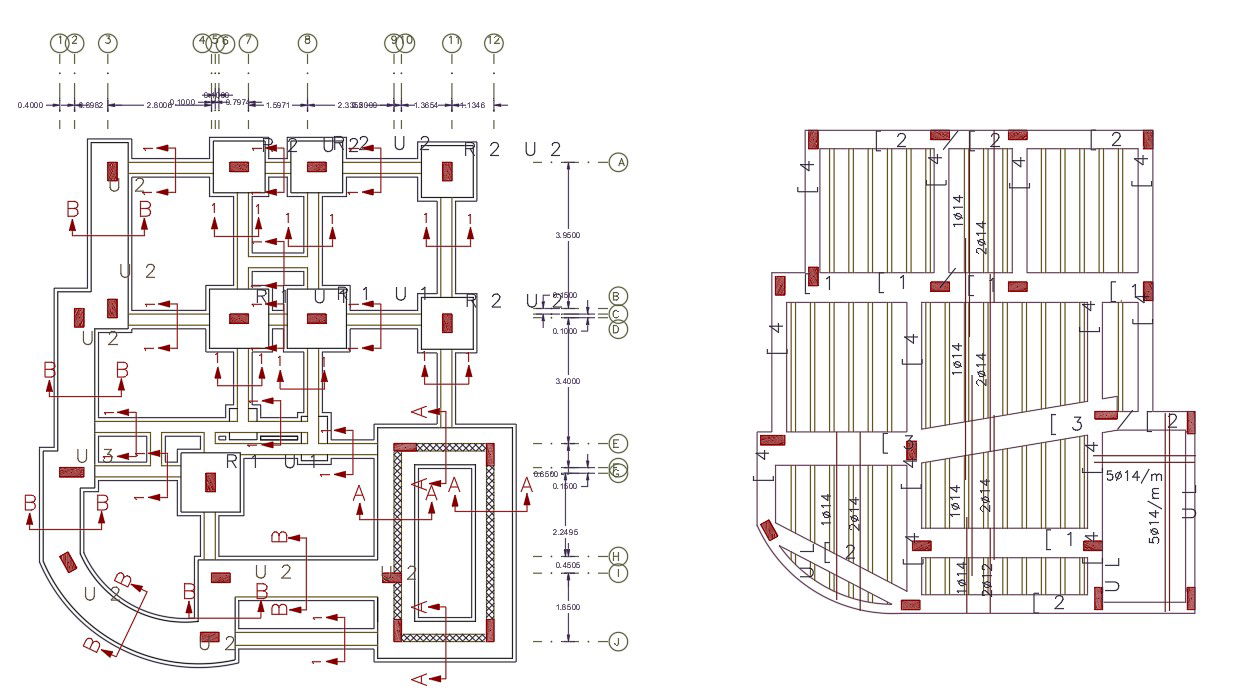Download free DWG file of 3 BHK house foundation plan with excavation detail and column slab bar structure design with centreline and margin dimension detail.
