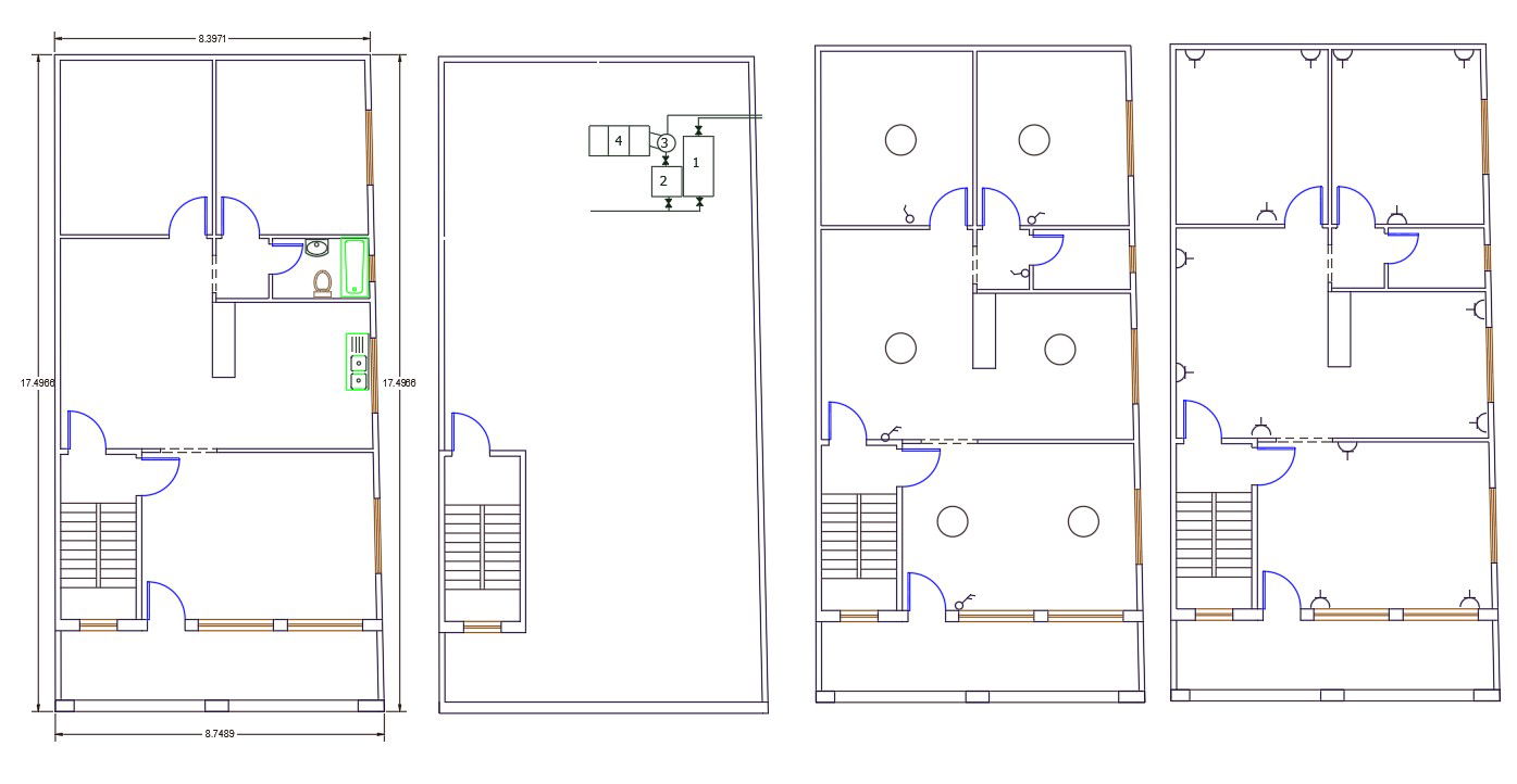 House Plan for 26 Feet by 55 Feet plot size 2 BHK floorplan CAD drawing includes electrical layout plan which is shown ceiling light and switchboard installation marking detail. download residence house electrical plan with sanitary ware detail DWG file.