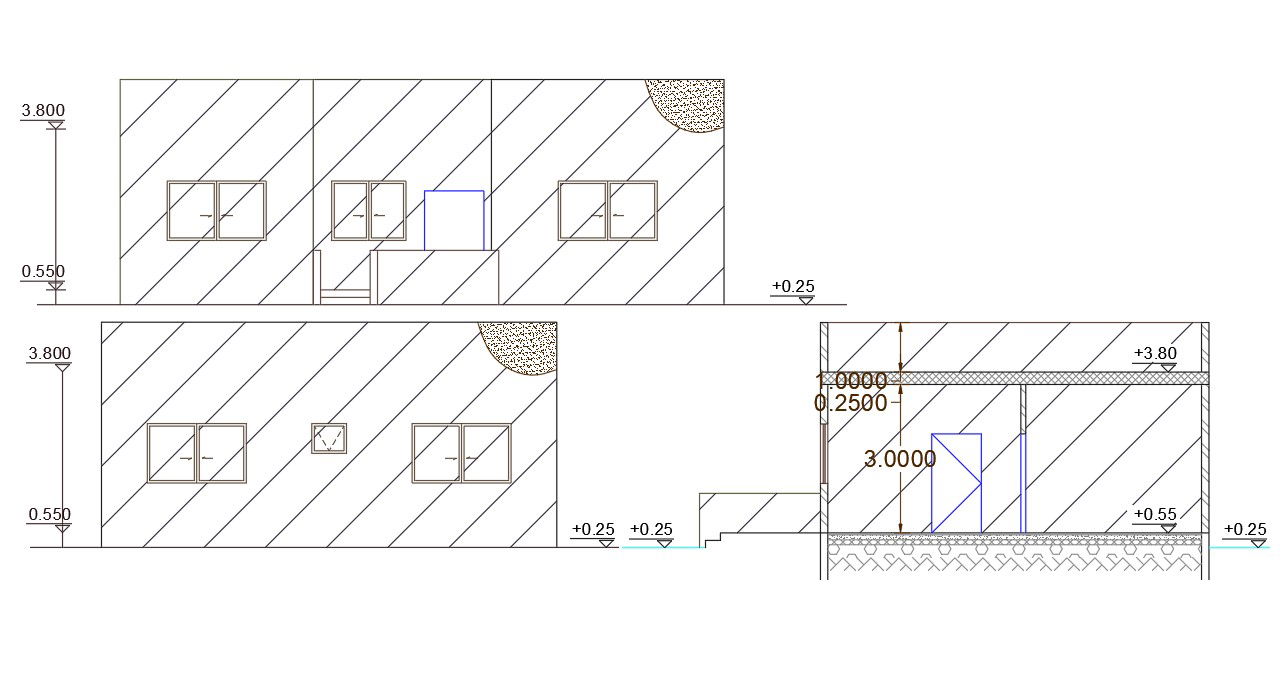 Download free DWG file of residence house single storey building design that shows front and side view with AutoCAD hatching design.