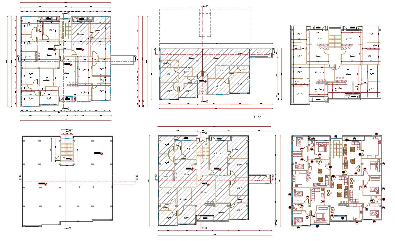 the architecture AutoCAD drawing of apartment house plan design that shows 3 unit house plan for 3 BHK apartment with column layout and spacious furniture layout plan design DWG file. download DWG file of apartment floor plan design DWG file and use this plan for your suitable project.