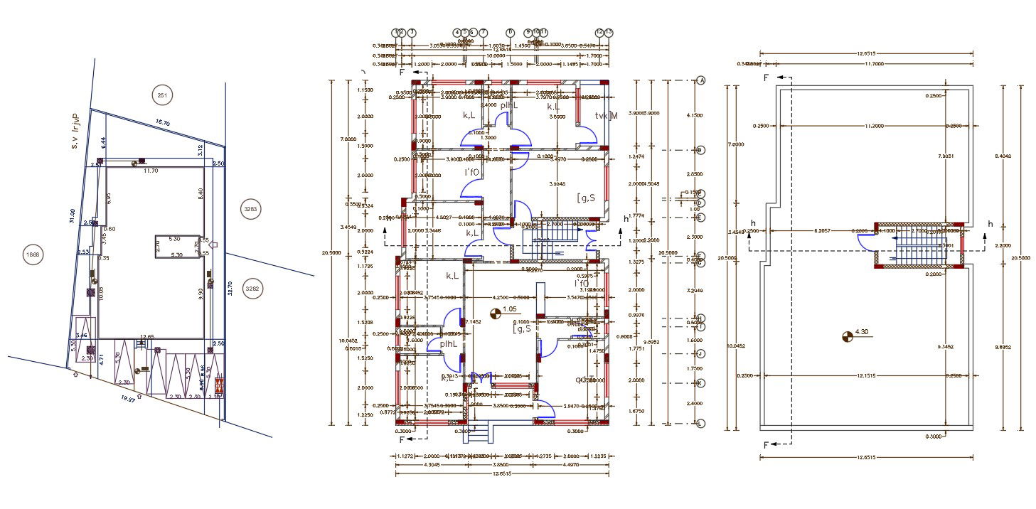 2d CAD Drawing of architecture house plan design that shows 3 bedrooms, kitchen, drawing and living room. also has a column layout and terrace plan with the master plan that shows build-up area, compound wall, and parking space. download apartment building design DWG file with all dimension detail.