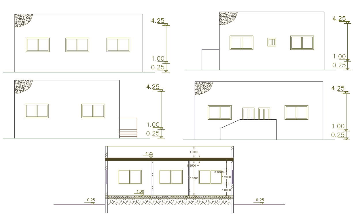 1080 sq ft plot size for 2 BHK house building sectional elevation design. download free 36 feet width and 30 depth of single-storey house building design DWG file.