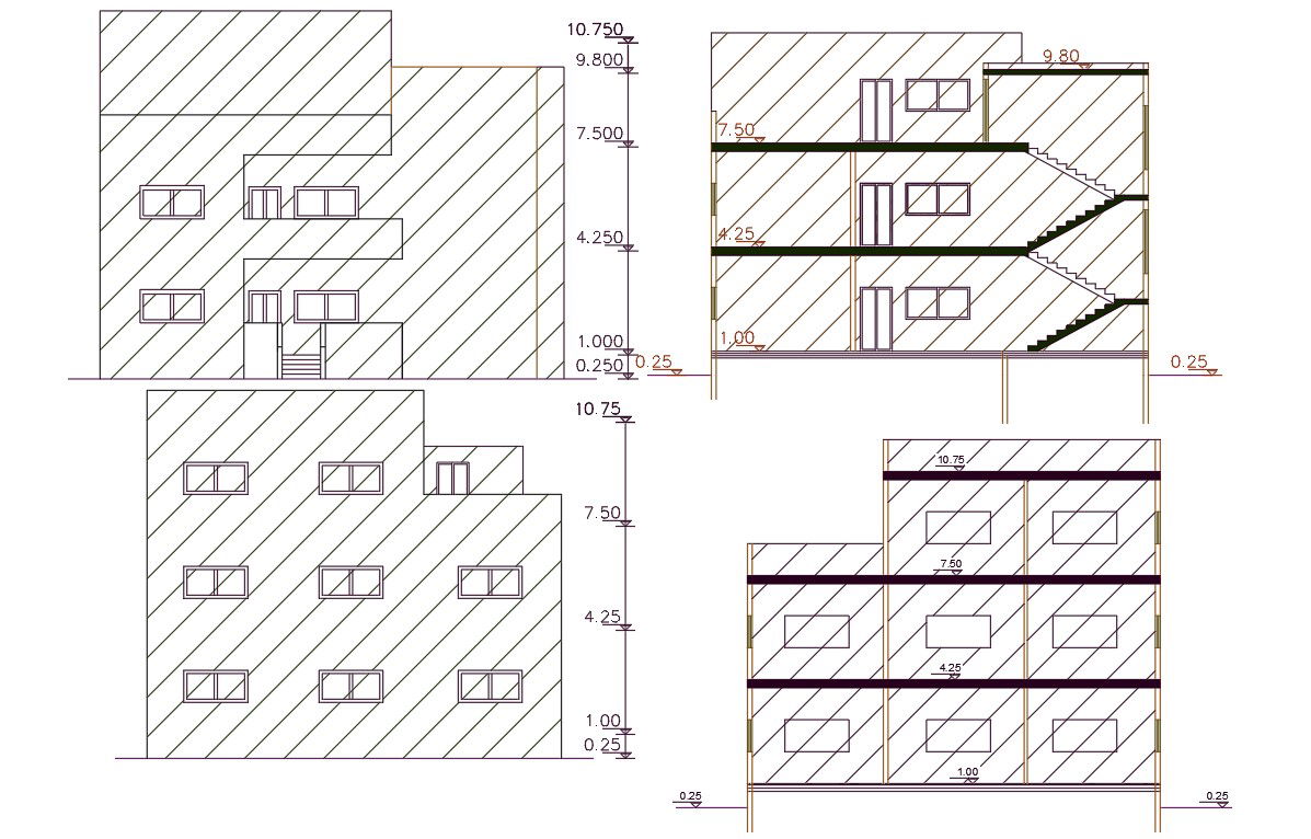 AutoCAD drawing of 2 BHK and 3 BHK apartment building front and rearview sectional elevation design with dimension detail. download 3 storey apartment building design DWG file.