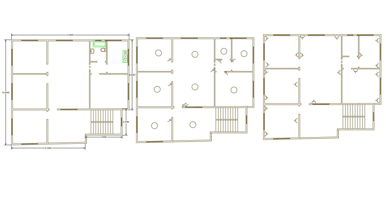 2d CAD drawing of 45 by 40 feet plot size for house electrical layout plan design that shows ceiling light point and switchboard installation marking detail. download 3 bedroom house plan design DWG file.