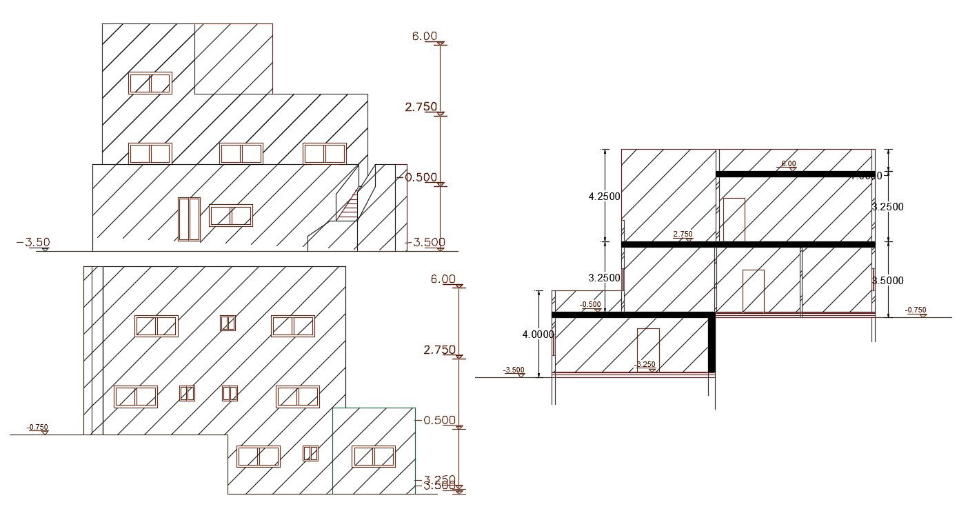 2D CAD drawing of 36 by 40 feet plot size for architecture luxurious bungalow building sectional elevation design that shows front and side view with dimension detail. download 1440 sq ft bungalow building design CAD file.