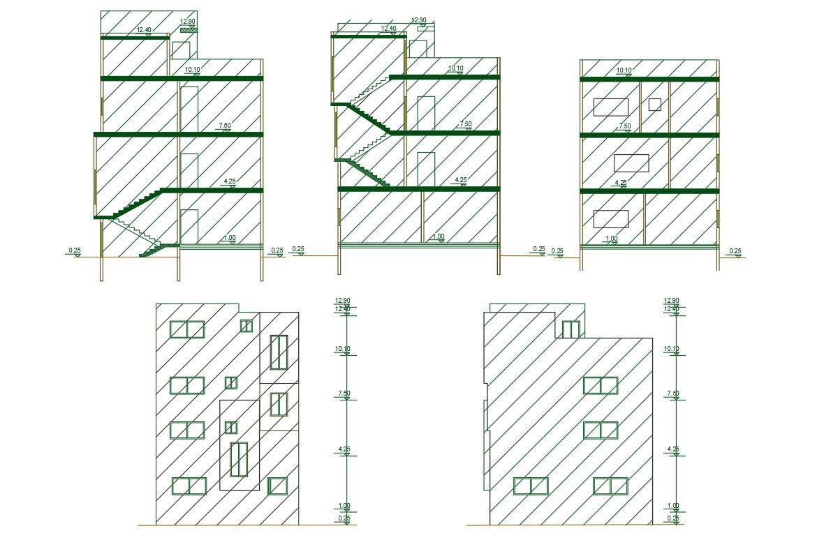 this is 2 BHK apartment house building for 26 by 30 feet plot size CAD drawing that shows 4 storey building section and elevation design with all dimension detail. download apartment sectional elevation design DWG file.