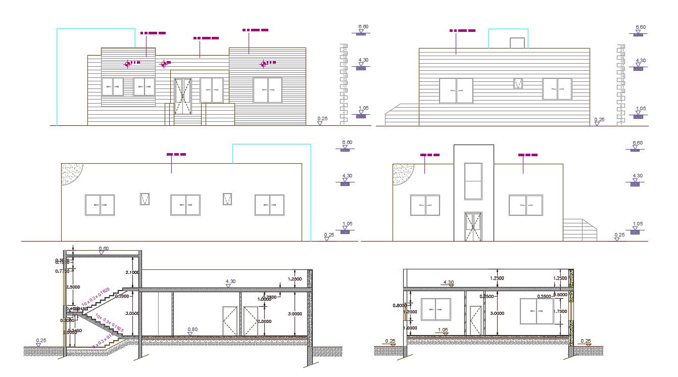 this is 3 bedroom ground floor house building sectional elevation design which is from number of view in different angle design also has staircase section and slab floor concrete with dimension detail. download DWG file of house building design.