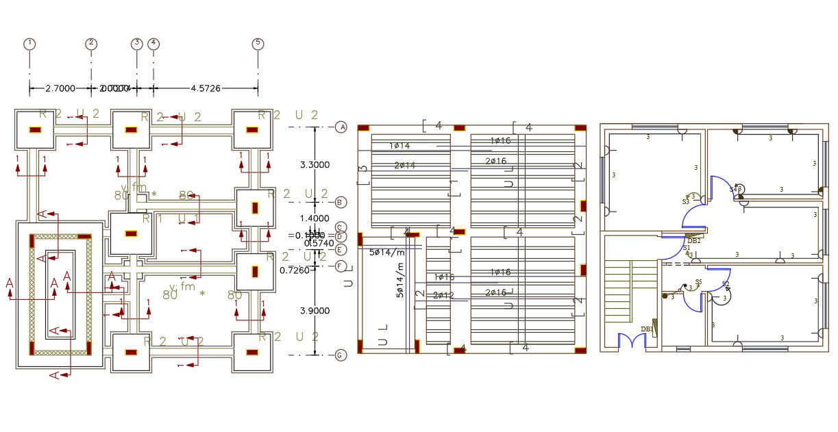 this is 2 BHK house construction working plan CAD drawing that shows foundation and slab bar structure design with centre line and dimension detail. download 32 by 32 feet house column footing plan design DWG file.