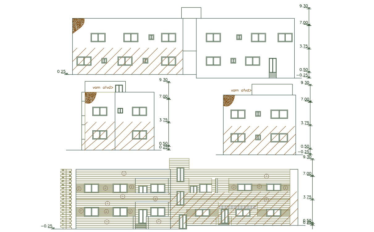 AutoCAD drawing of 3 BHK house building elevation design that shows four side view with 2 storey floor level detail, door and window located marking. download beautiful front elevation design of residence building with dimension.