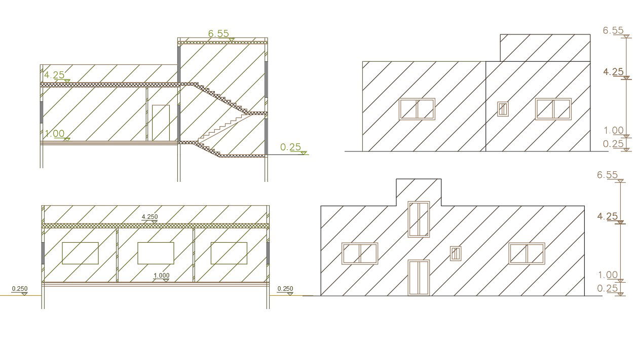 2D CAD drawing of house building 40 by 40 feet plot size that shows single storey floor level with dimension detail. download front and side view sectional elevation design DWG file.