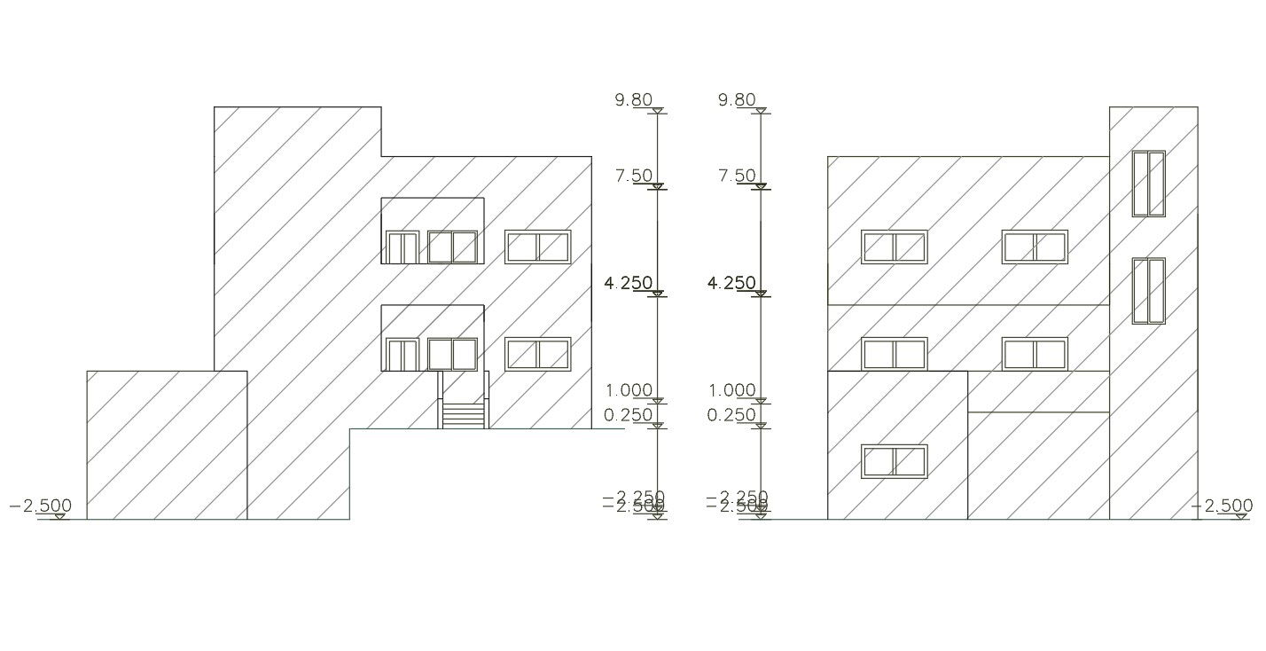 2d CAD drawing of architecture house building front and side view elevation design that shows 2 storey floor level and some AutoCAD hatching design with dimension detail DWG file.