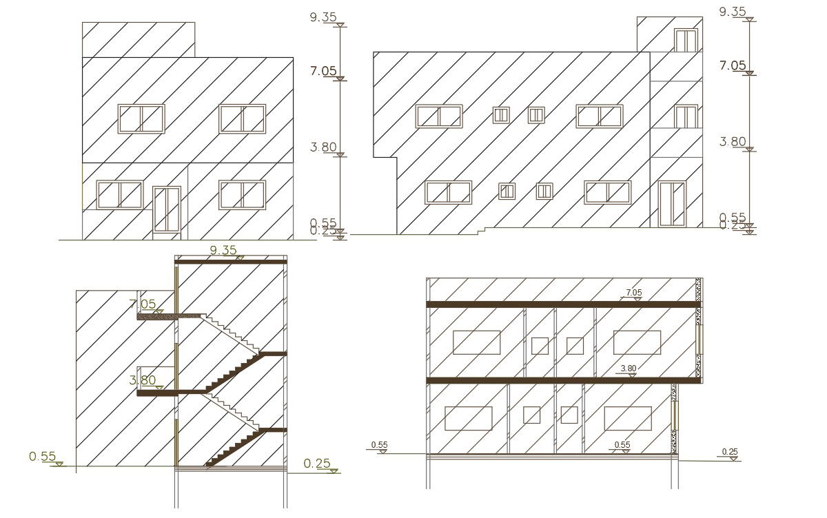 1350 square feet AutoCAD house 2 storey building front and side view sectional elevation design that shows staircase and slab design. download 30 feet width and 45 feet depth of house building design DWG file.